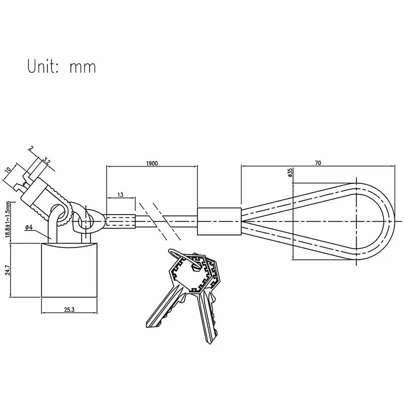 The foot bolt is made of zinc alloy. The steel cable has a diameter of 4mm and a length of 1.9 meters. The tensile strength is more than 80KGs. It can be locked on the desktop or any fixed structure. It is light and easy to carry.